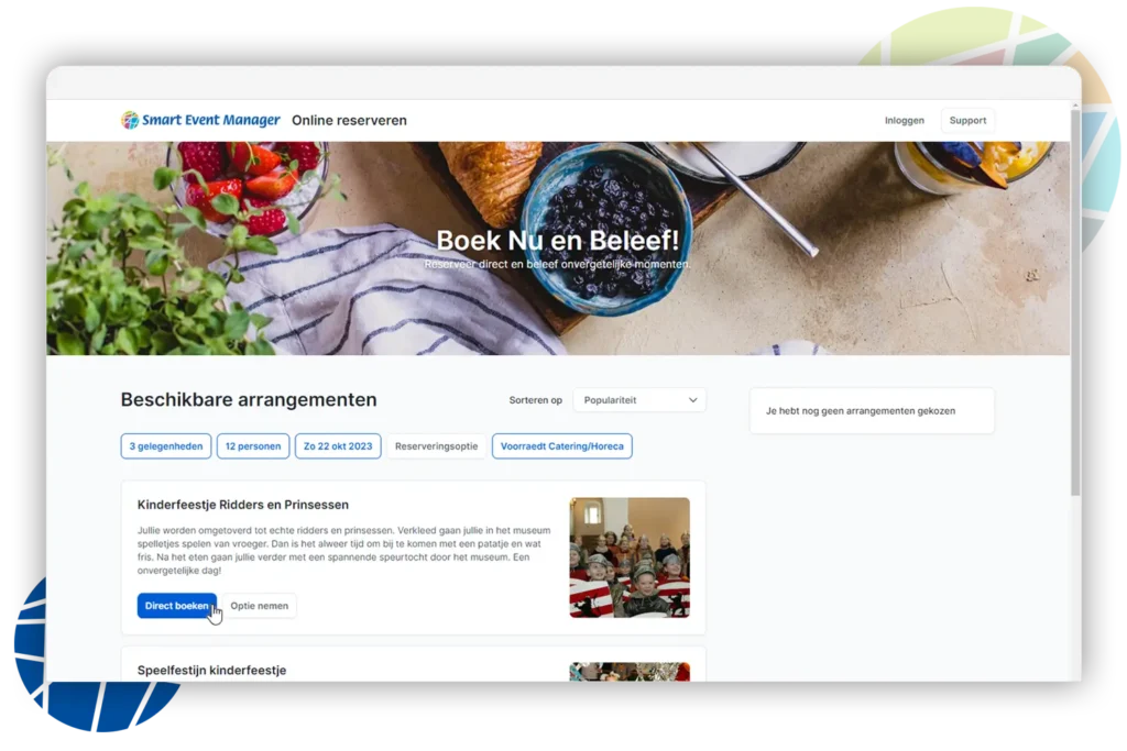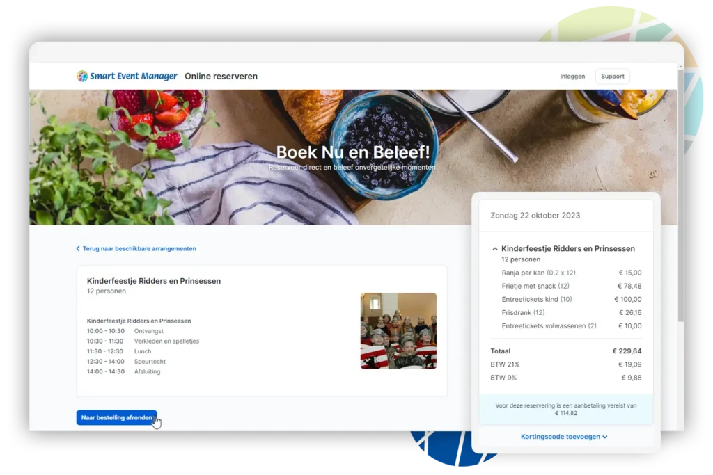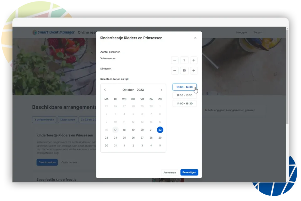 Produkte und Dienstleistungen hinzuzufügen. Dadurch eröffnen wir Ihnen weitere Möglichkeiten zum Upselling. Möchten Sie, dass Ihre Kunden direkt online bezahlen oder eine Anzahlung leisten? Fügen Sie einfach diesen Schritt zum Online-Buchungsprozess hinzu, und die Zahlung wird nahtlos in Smart Event Manager verarbeitet. So wird die Online-Buchung noch einfacher und effizienter gestaltet.