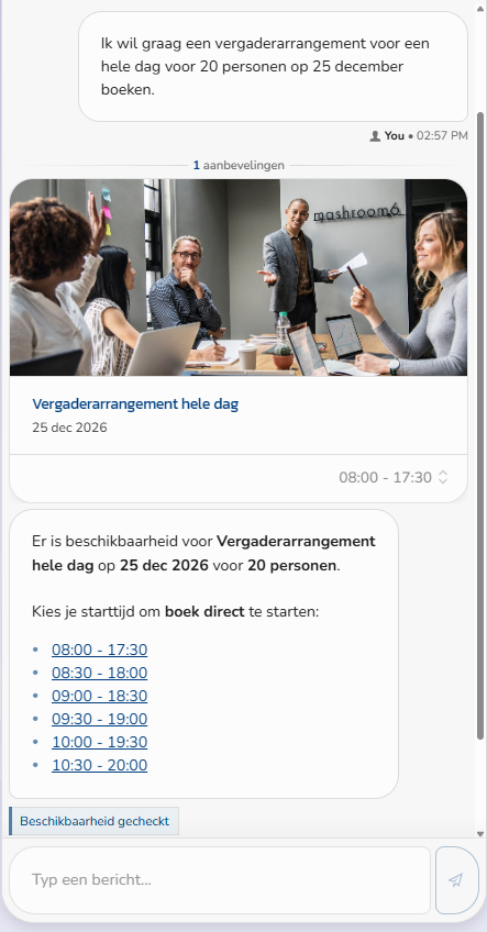Een extra voordeel is dat de chatbot alternatieven kan voorstellen. Is een datum of arrangement niet beschikbaar, dan kan de chatbot een andere datum of passend alternatief aanbieden.